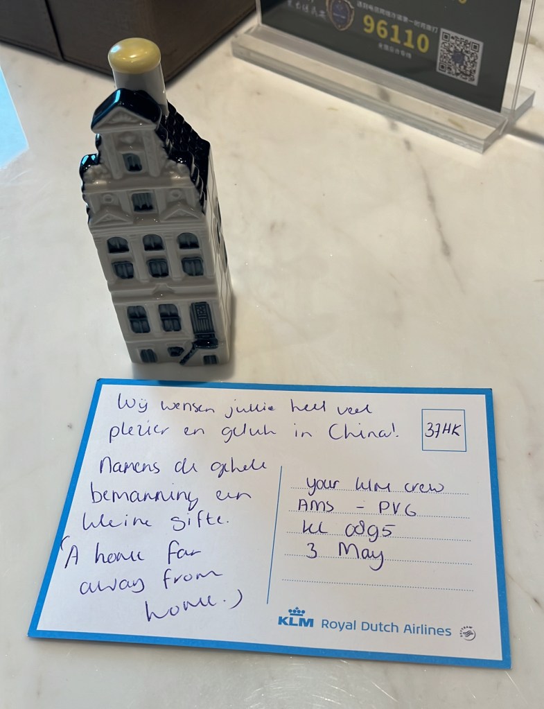 Na een vlucht van 12 uur landden we op 4 mei rond 9:30 lokale tijd (3:30 NL tijd) op Shanghai Airport. Tijdens de vlucht vielen we, tussen toch wel veel Chinese passagiers, op als Nederlanders. Omdat wij vlogen met KLM, sprak de crew Nederlands. Zo raakten we makkelijk aan de praat met een steward en vertelden we wat ons naar China bracht. Aan het einde van de vlucht kregen we nog een kleinigheidje van de steward, super lief!